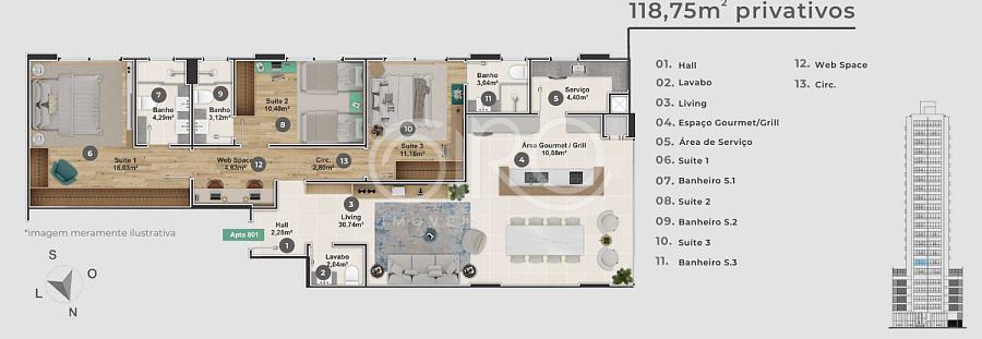 - Área privativa de 118,75m²